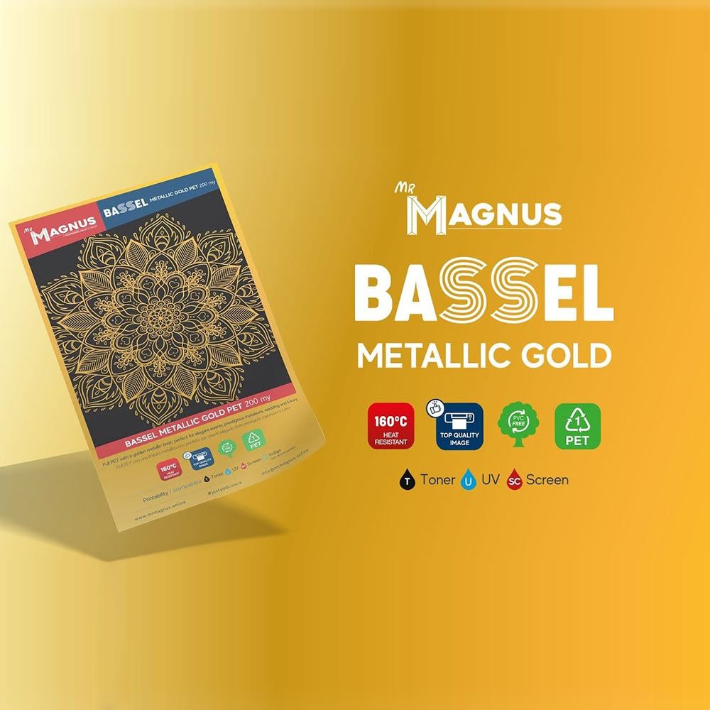Το bassel Metallic gold, είναι πολυεστερικό φύλλο PET , για εκτύπωση laser και από τις δυο όψεις. Διαθέτει περλέ χρυσό φινίρισμα και από τις δυο πλευρές. Μεταλλικό. Είναι ανθεκτικό στο σκίσιμο, αδιάβροχο, ενώ μπορεί να καθαριστεί εύκολα. Είναι ιδανικό για εκτύπωση εικόνων διαφήμισης στον τομέα της μόδας, της ομορφιάς και των κοινωνικών εκδηλώσεων.